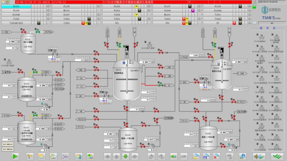 本項目中采用的雙滴加自動控溫、自動分相、稱重自動濃縮、PH自動控制以及配套回收系統(tǒng)全自動一鍵啟車等一系列先進的合成工藝控制技術,并且所有過程數(shù)據(jù)自動儲存,可隨時調取查詢,保證生產過程數(shù)據(jù)完整性、可追溯性,成功助力自動化生產。多種技術的應用讓該項目工藝參數(shù)控制更加精準,減小了人為操作與干預,增強了生產過程中的可控性,實現(xiàn)了自動化工廠新理念。