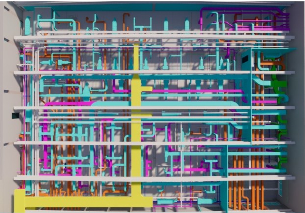 該項目為改造升級項目,在空間、布局上有很大限制。首先,原有管道阻礙了吊頂夾層空間檢修通道的設(shè)計;其次,該項目潔凈區(qū)位于二層,改造升級涉及兩個建筑層高不相同的區(qū)域,北區(qū)為輔助區(qū)層高較低,南區(qū)為主潔凈區(qū)層高較高,而車間空調(diào)機(jī)房在車間南區(qū)。這就造成了空調(diào)的送排風(fēng)系統(tǒng)由南區(qū)域進(jìn)入北區(qū)域時,其風(fēng)管會因空間狹小受到嚴(yán)重阻礙。面對種種困難,天俱時集團(tuán)BIM團(tuán)隊不斷深化設(shè)計、優(yōu)化布置,將送回風(fēng)管、排風(fēng)管、管道系統(tǒng)等標(biāo)高進(jìn)行優(yōu)化排布,充分利用空間,不僅解決了空調(diào)系統(tǒng)送排風(fēng)管道問題,也使得操作檢修更為方便。