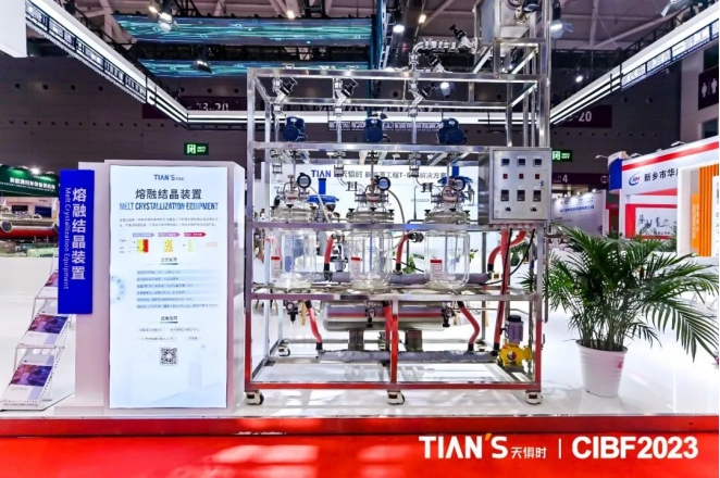 合而共贏,方能健步前行。在本次展會中,天俱時(shí)集團(tuán)展位還展出了戰(zhàn)略合作伙伴重慶敏恒科技有限公司所帶來的熔融結(jié)晶裝置與分子蒸餾裝置。其中,熔融結(jié)晶裝置相較于傳統(tǒng)列管結(jié)晶可節(jié)省占地面積與投資成本,提升效率,并且產(chǎn)品純度最高可達(dá)99.9999%,廣泛應(yīng)用于VC/FEC等添加劑領(lǐng)域。分子蒸餾裝置可使液體在遠(yuǎn)低于沸點(diǎn)的溫度下分離,并且受熱時(shí)間短,分離程度高,可做到連續(xù)流,特別適用于熱敏性物質(zhì)的蒸餾提純。